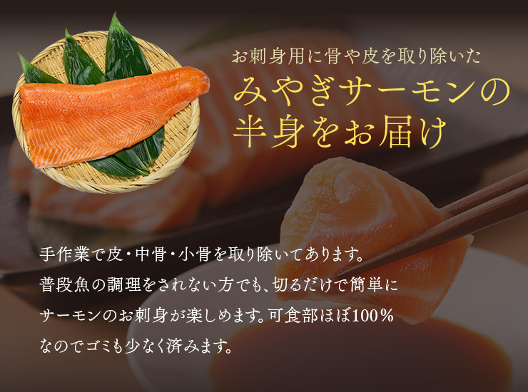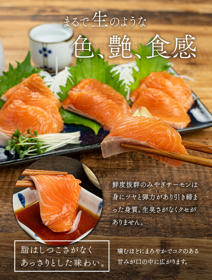 みやぎサーモン 半身(400~500g) 皮なし骨取り済 養殖 まるで生のような食感、クセがなく噛むほどに甘みが広がります。送料無料(お中元 敬老の日 刺身 海鮮丼 手巻き寿司 寿司ネタ おつまみ 誕生日 御祝 内祝 ギフト 鮭)[[みやぎサーモン]