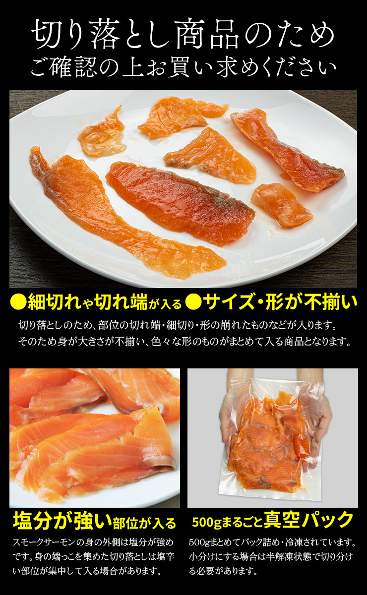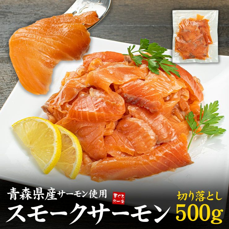 スモークサーモン 切り落とし 500g 青森県産 (切落し 端材 切れ端 細切れ 不揃い) 3個で送料無料 鮮度抜群の国産サーモンをじっくりスモークして旨みを引き出しました [[青森スモークサーモン切落し]
