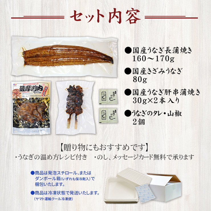 【送料無料】国産うなぎ福袋(長蒲焼き160~170g、きざみうなぎ80g、うなぎ肝串焼き2本)タレ・山椒つき《not-du1》〈ue1〉yd9[[国産うなぎ福袋]