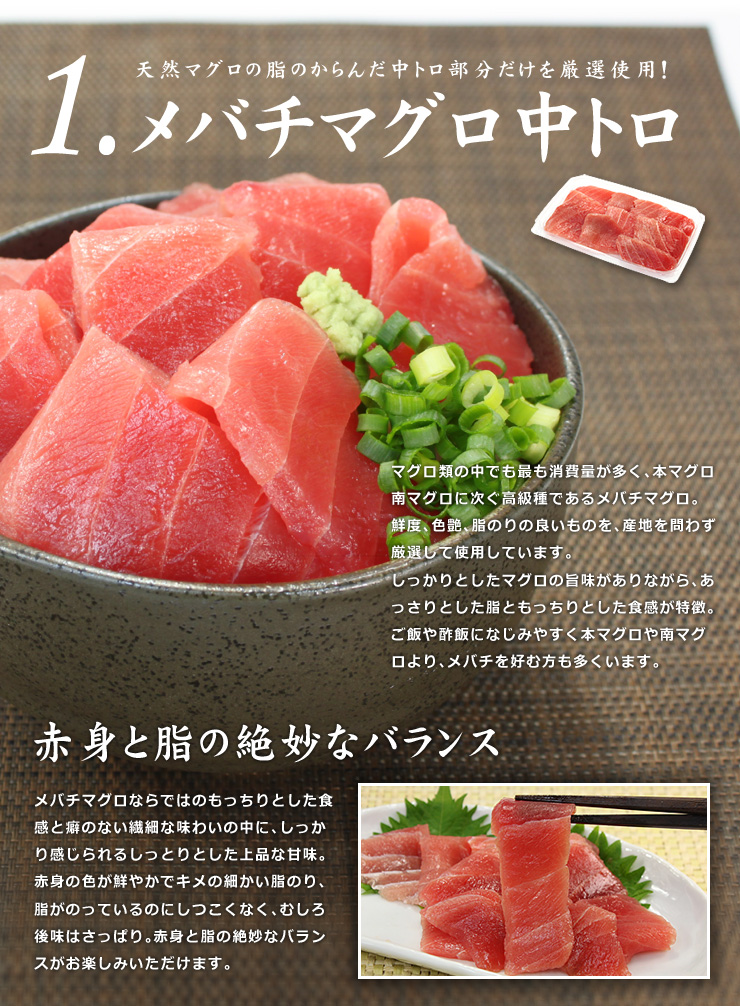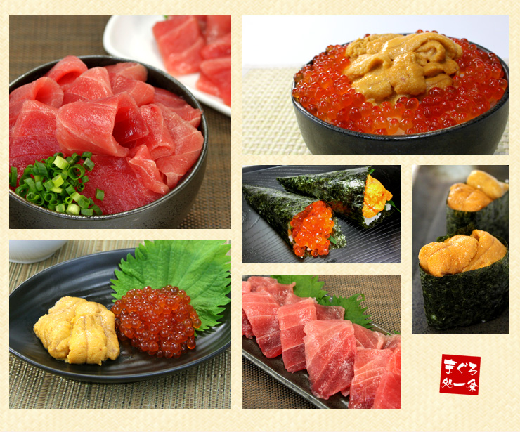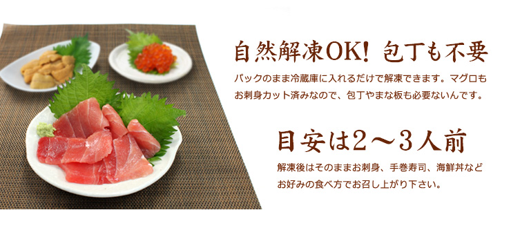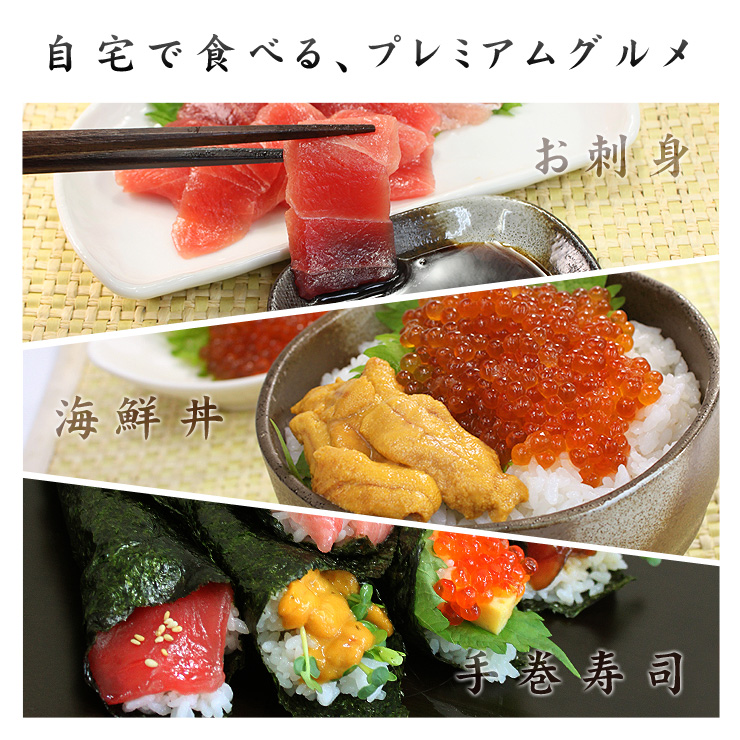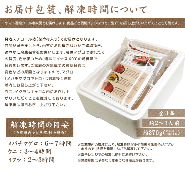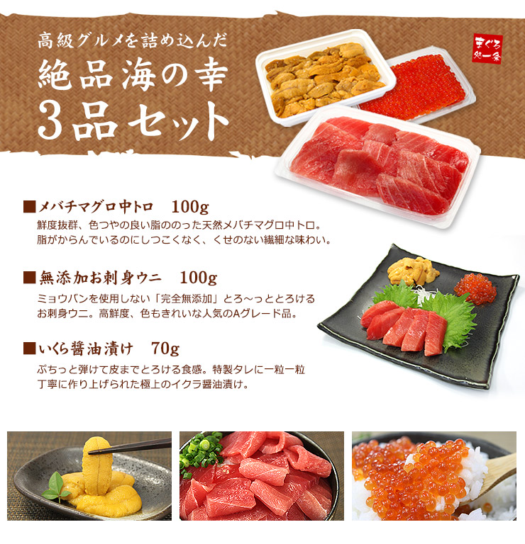 メバチ鮪中トロ100g、お刺身ウニ100g、いくら醤油漬け70g
