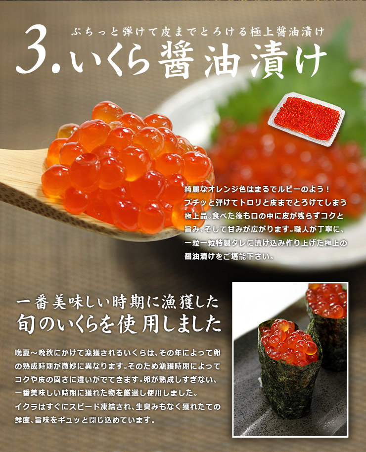 【イクラ】いくら(鮭の卵(アメリカ産))、醤油加工品(小麦・大豆を含む)、醤油(小麦・大豆を含む)