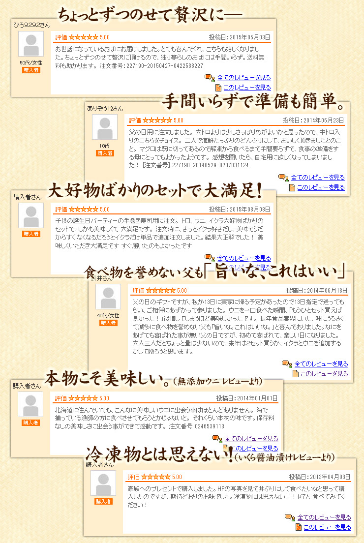 ウニ、イクラ:商品に記載(冷凍庫保存で1ヶ月以内推奨)、解凍後即日。