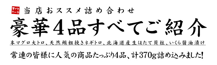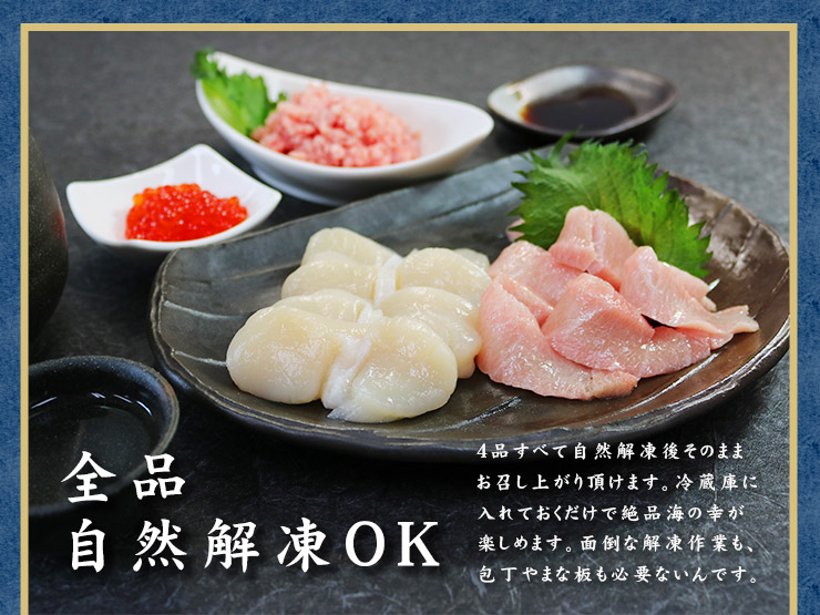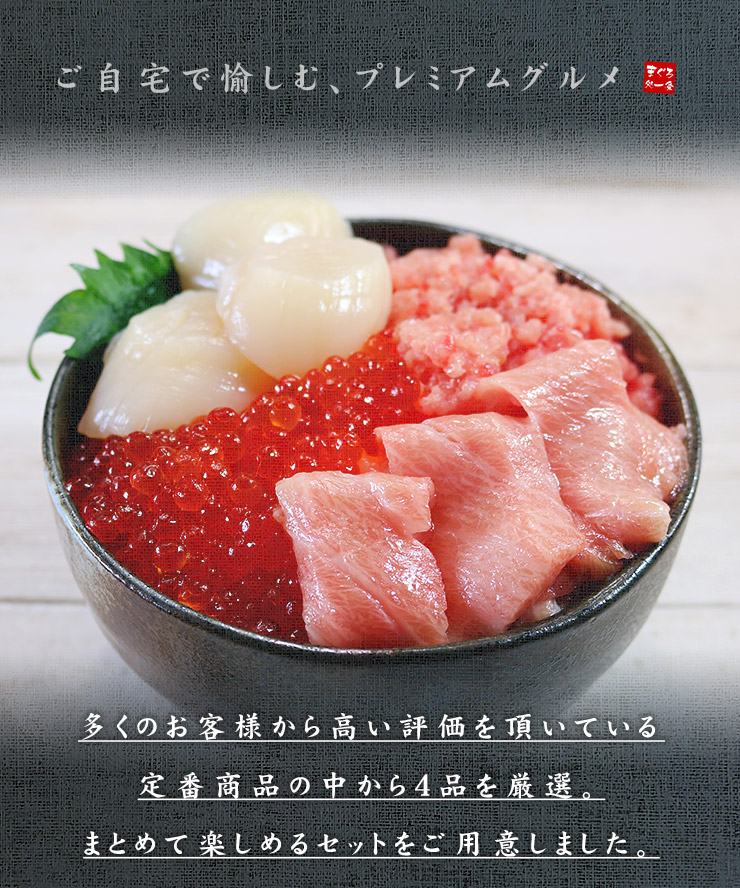 本マグロ大トロ、天然鮪粗挽きネギトロ、北海道産生ほたて貝柱、いくら醤油漬け