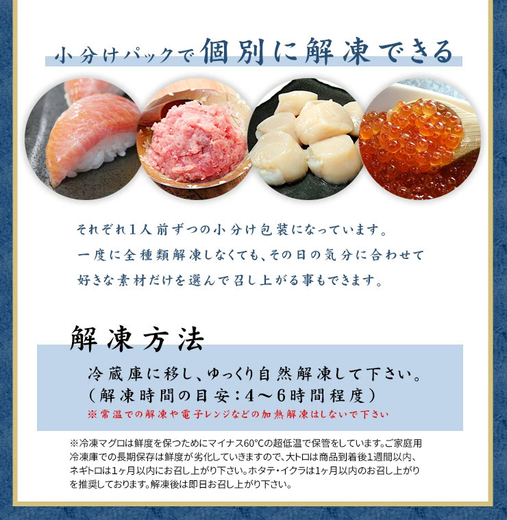 【ホタテ、イクラ】商品に記載。※お届け後、冷凍保存で約1ヶ月推奨。解凍後即日