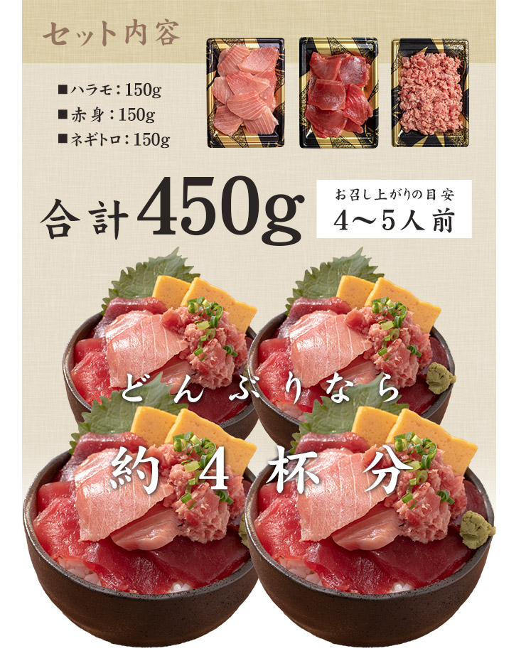 ハラモ150g、赤身150g、ネギトロ150g