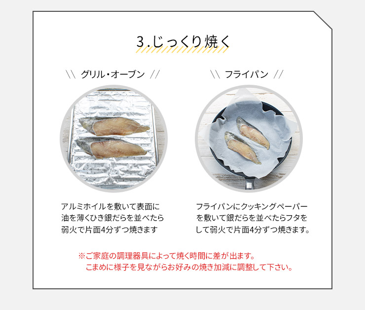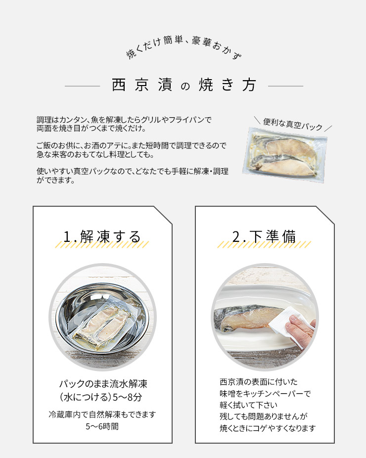 流水解凍または冷蔵庫内で自然解凍後、魚焼きグリルなどで加熱調理して下さい