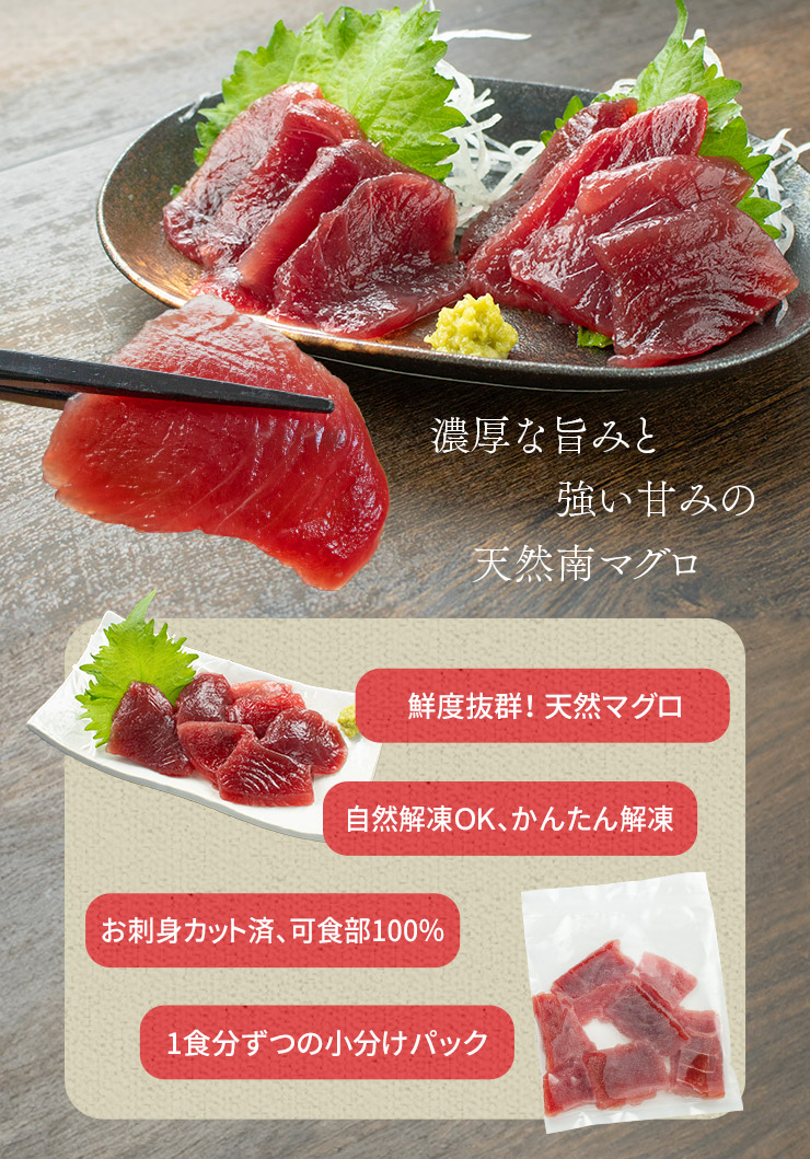貴重な天然南マグロ!お刺身カット済だから解凍するだけで召し上がれます。