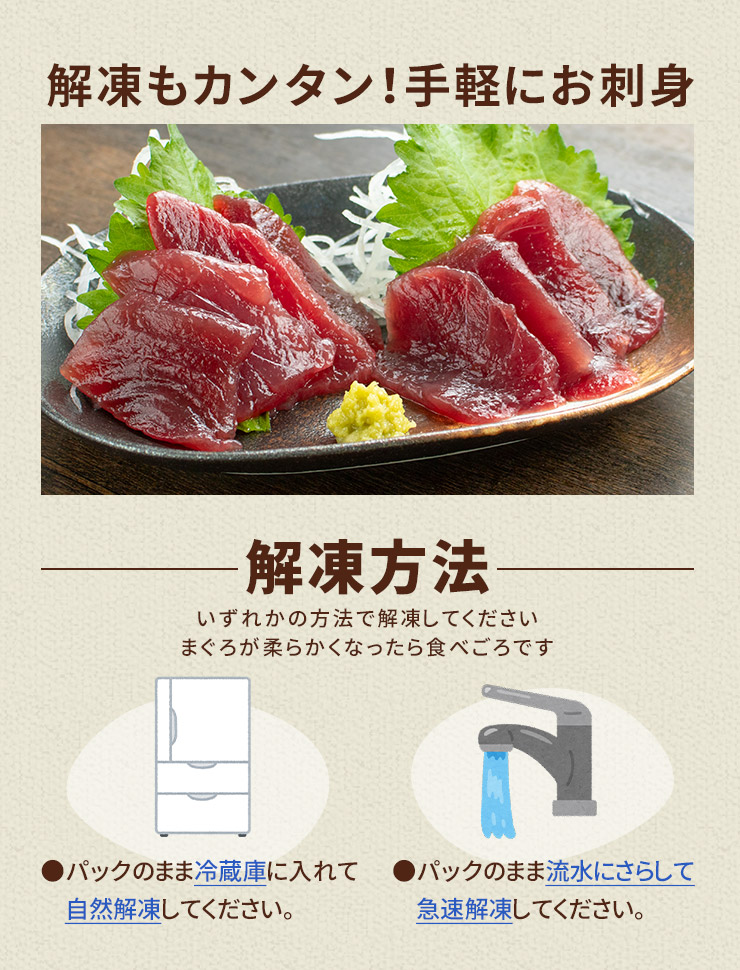 冷蔵庫内で自然解凍、またはパックのまま流水解凍