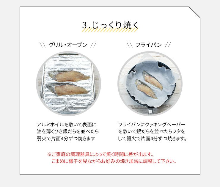 流水解凍または冷蔵庫内で自然解凍後、魚焼きグリルなどで加熱調理して下さい