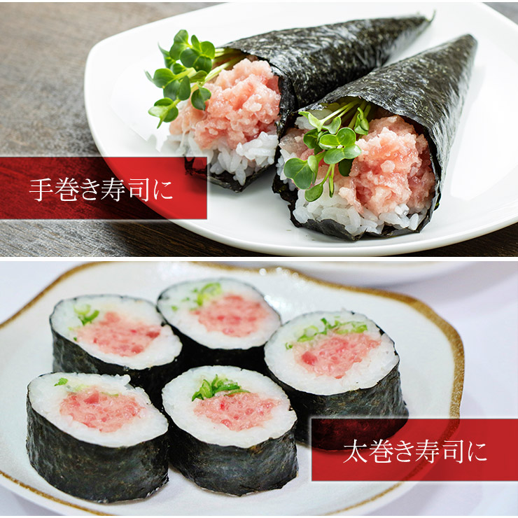 鮮度のよい天然のマグロを厳選して使用しています。2種類のマグロをバランスよく配合して、臭みの無いあっさりとした味わい、それでいて舌の上でとろっとなめらかな食感に仕上げました。流水解凍が可能で最短5分で召し上がれます。