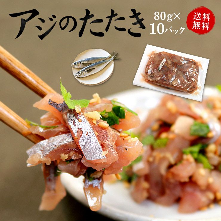 【送料無料】 国産アジのタタキ80g×10パック ぷりっぷりの食感、旨みたっぷりのアジを気軽に味わえます。お好みの薬味と一緒に 海鮮丼なら一人前【ajt】《ref-aj2》yd5[[アジたたき80g-10p]