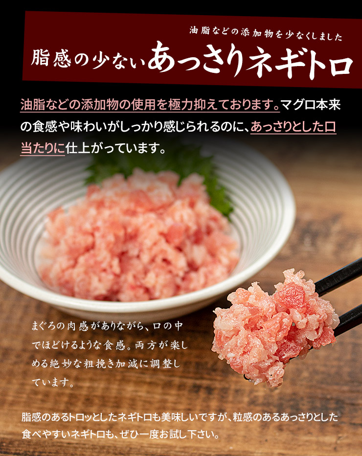鮮やかな色の天然まぐろから、さらに鮮度の良いものを厳選。粗く叩いて粒感をたっぷり残し、まぐろ本来の味わいが楽しめるネギトロに仕上げました。油脂や添加物の使用を極力抑えておりますので、まぐろの肉感がありながらさっぱりとしたネギトロとなっています。自然解凍OK、300gでどんぶり3杯分。