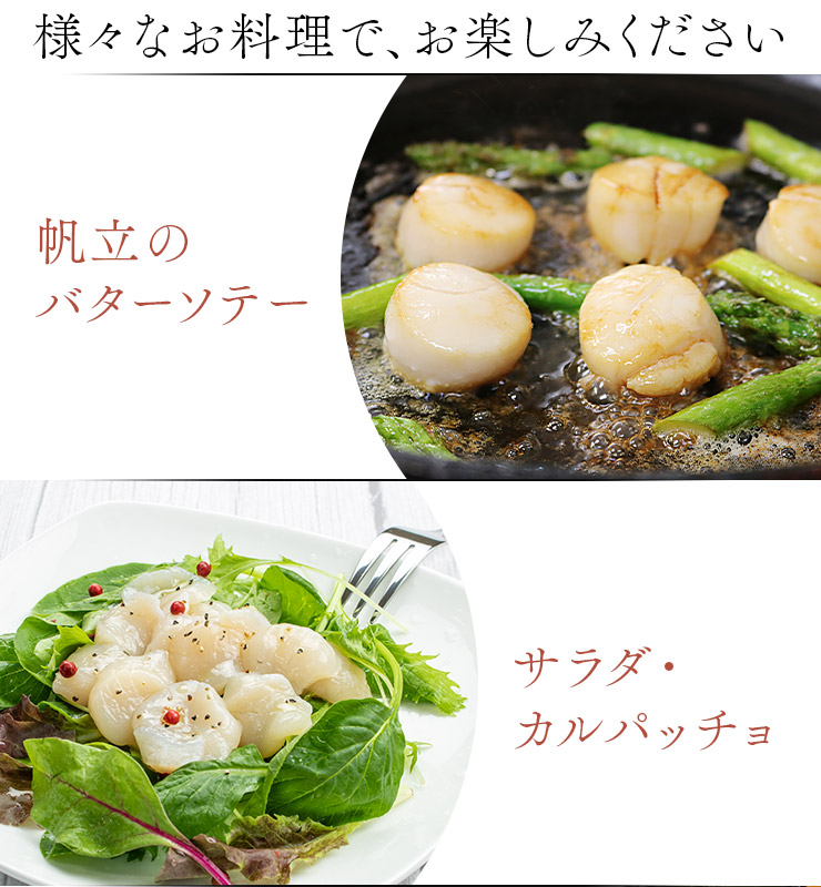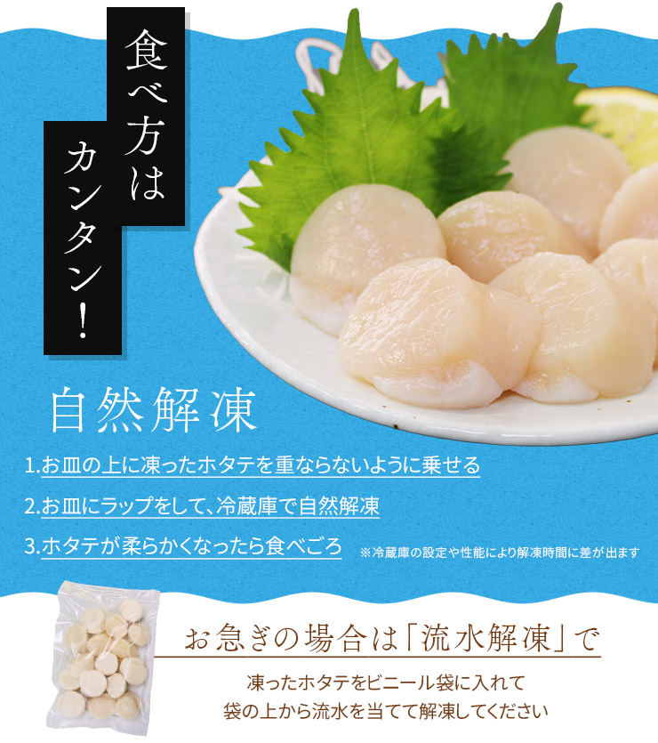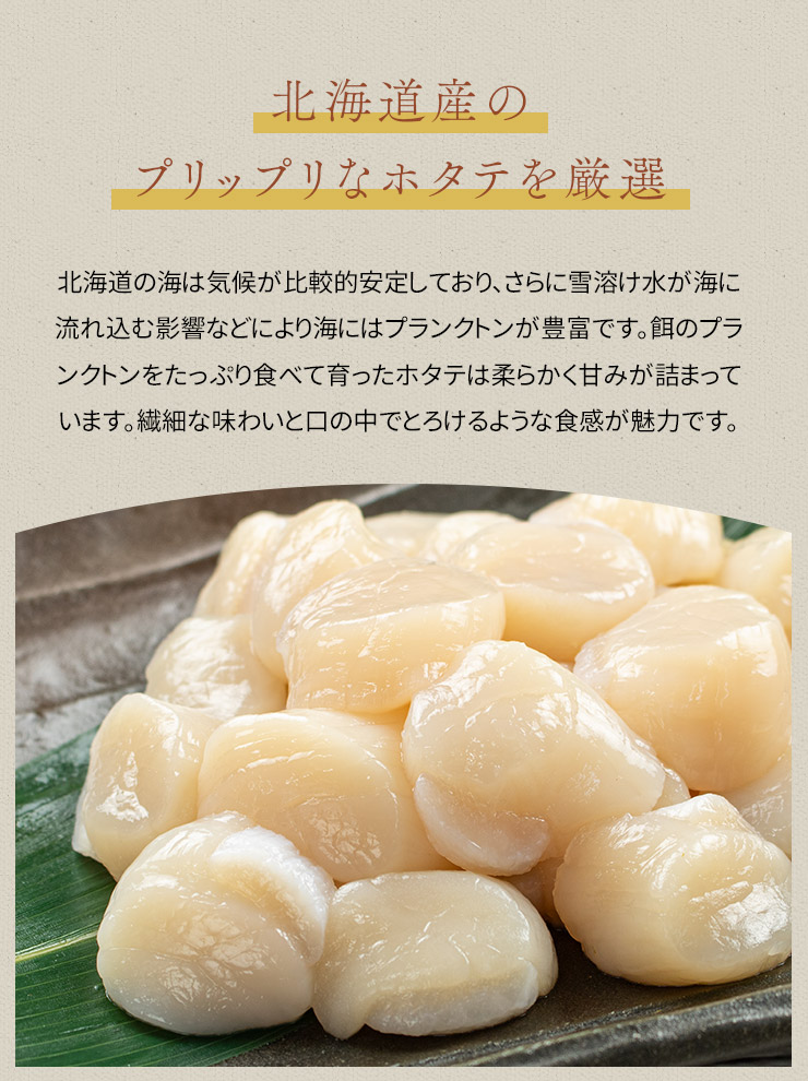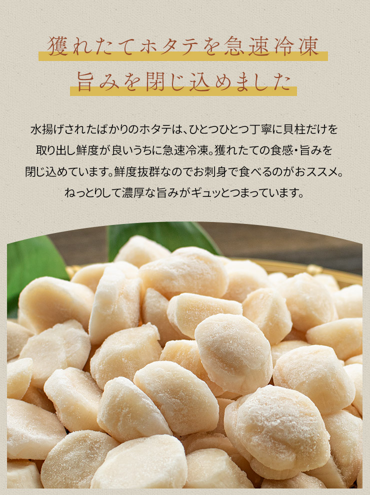 冷たい海で獲れた生ほたてをたっぷりお届け!バラ凍結で小分けもOK。