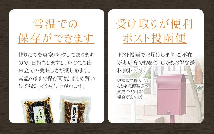 他の画像を見る 送料無料 あさり佃煮 あさり昆布 2種セット ご飯のお供に、酒の肴に (ポスト投函便、常温、同梱不可)[[あさり佃煮2種セット] 販売価格 ¥ 1,000 税込 在庫切れ ポスト投函便、送料無料! 詳細を見る お気に入りに登録する