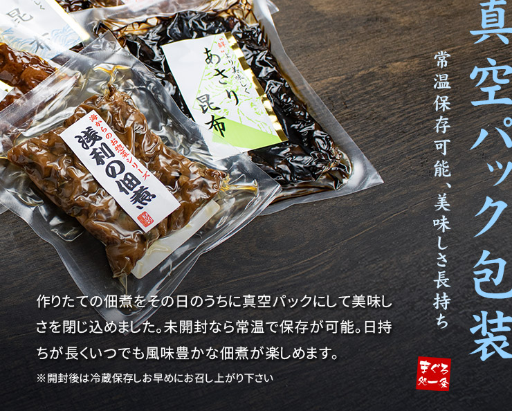 【あさり昆布】あさり(中国)、醤油(小麦・大豆を含む)、砂糖、昆布、醸造調味料、麦芽水飴、鰹節エキス、食塩、寒天/調味料(アミノ酸等)、カラメル色素、保存料(ソルビンK)、甘味料(ステビア)、酸味料