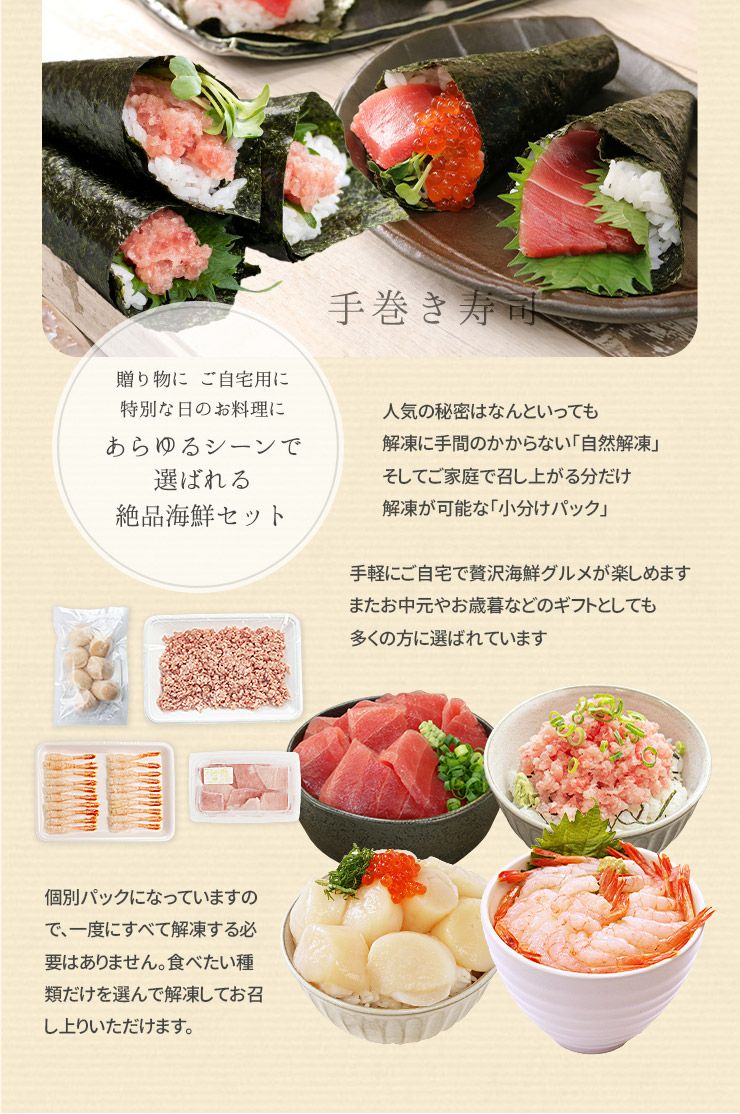 他の画像を見る 【送料無料】海鮮4品セット「彩」いろどり 3~4人前 マグロ中トロ、ネギトロ、生ほたて、甘えび 自然解凍OK (ギフト プレゼント お中元 御中元 海鮮丼 手巻き寿司 海鮮福袋 刺身 おつまみ)〈ird1〉yd9[[海鮮セット彩いろどり] クール便でお届け 販売価格 ¥ 4,680 税込 自然解凍ですぐ食べられる高級海鮮セット カートに入れる お気に入りに登録する