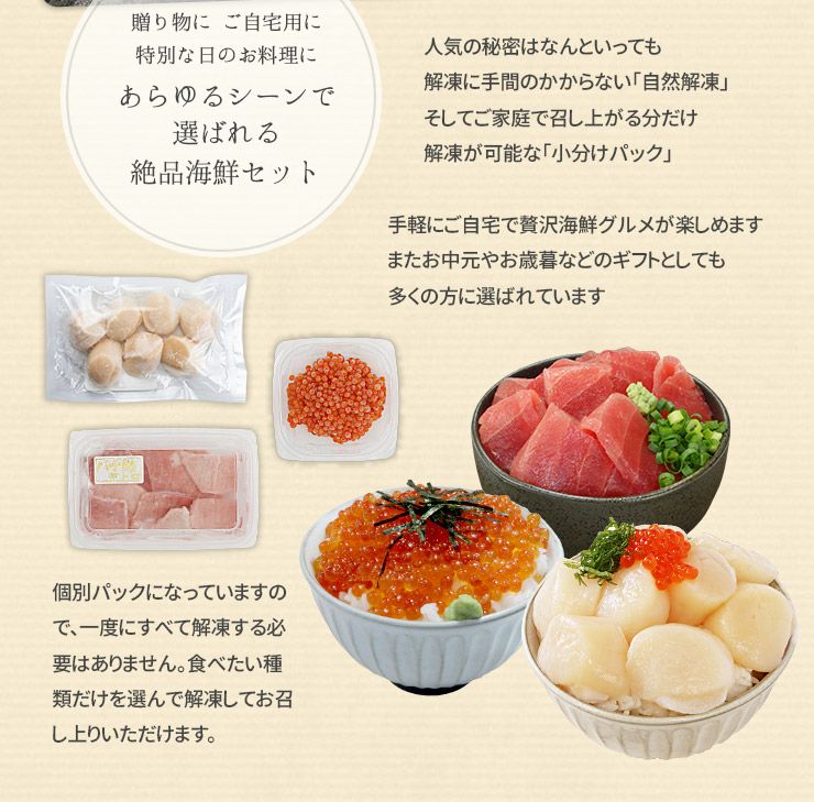 他の画像を見る 【送料無料】海鮮四色丼セット 本マグロ大トロ、ネギトロ、生ほたて、イクラ 海鮮福袋 《not-ysd1》〈ysd1〉yd9[[海鮮四色丼] クール便でお届け 販売価格 ¥ 5,480 税込 自然解凍ですぐ食べられる高級海鮮セット カートに入れる お気に入りに登録する