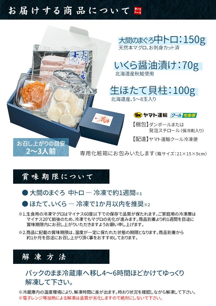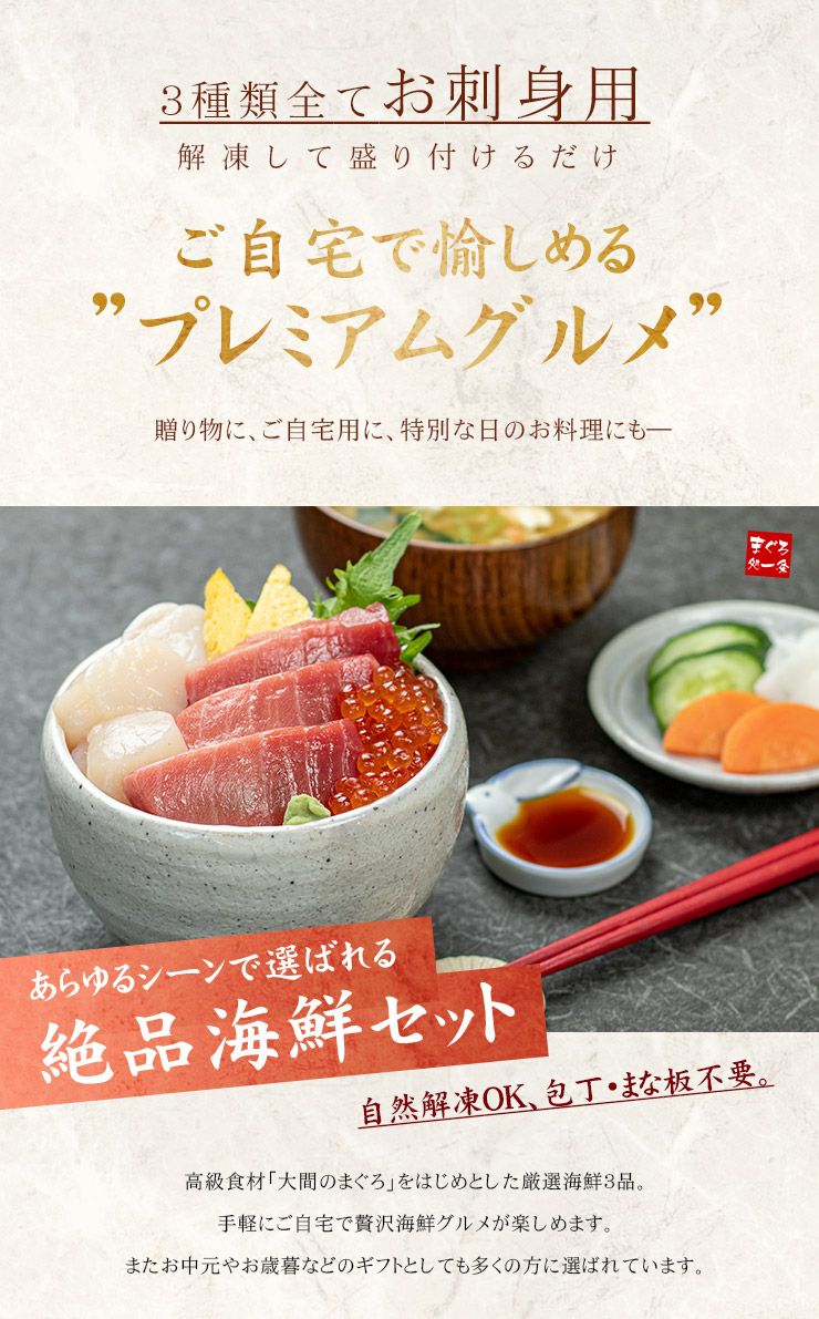 他の画像を見る 【送料無料】 海鮮3品セット「漣」さざなみ 2~3人前 マグロ中トロ、生ほたて、いくら醤油漬け 自然解凍OK (プレゼント 海鮮丼 手巻き寿司 海鮮福袋 刺身 おつまみ)〈szn1〉yd9[[海鮮セット漣さざなみ] クール便でお届け 販売価格 ¥ 4,480 税込 自然解凍ですぐ食べられる高級海鮮セット カートに入れる お気に入りに登録する