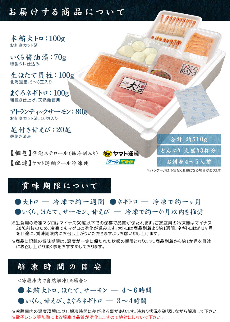 <ホタテ、イクラ、サーモン、甘えび>商品に記載 ※お届け後、冷凍保存で約1ヶ月推奨。解凍後即日
