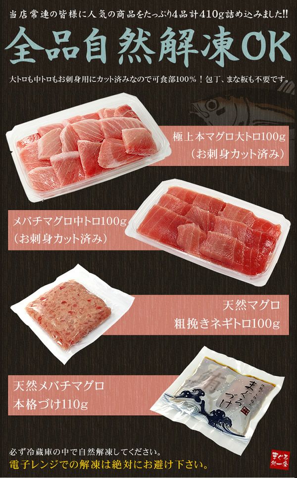 他の画像を見る 【送料無料】まぐろ尽くし福袋 大トロ、中トロなど色々なマグロ4品詰め合わせ!自然解凍でOK 総合ランキング1位獲得 海鮮福袋《not-ds1》〈ds1〉yd5[[マグロ尽くし福袋] クール便でお届け 販売価格 ¥ 4,980 税込 全品マグロの豪華セット!大トロ、中トロ、ネギトロ、づけ カートに入れる お気に入りに登録する