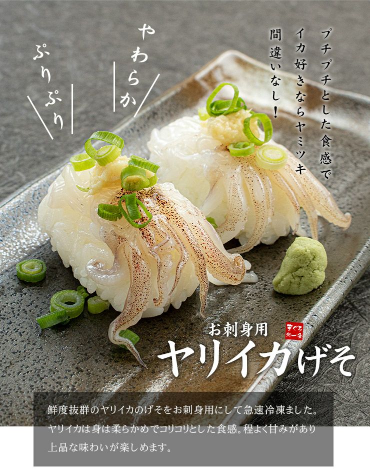他の画像を見る お刺身用ヤリイカげそ20枚入り 新鮮だからコリコリ・プチプチとした食感!身質が柔らかくて上品な甘みが楽しめます。自然解凍OK(寿司ネタ 海鮮丼 手巻き寿司 誕生日 ギフト プレゼント)《ref-sq2》yd9[[ヤリイカげそ20枚] クール便でお届け 販売価格 ¥ 698 税込 お寿司や海鮮丼、手巻寿司にも(いか、烏賊) カートに入れる お気に入りに登録する