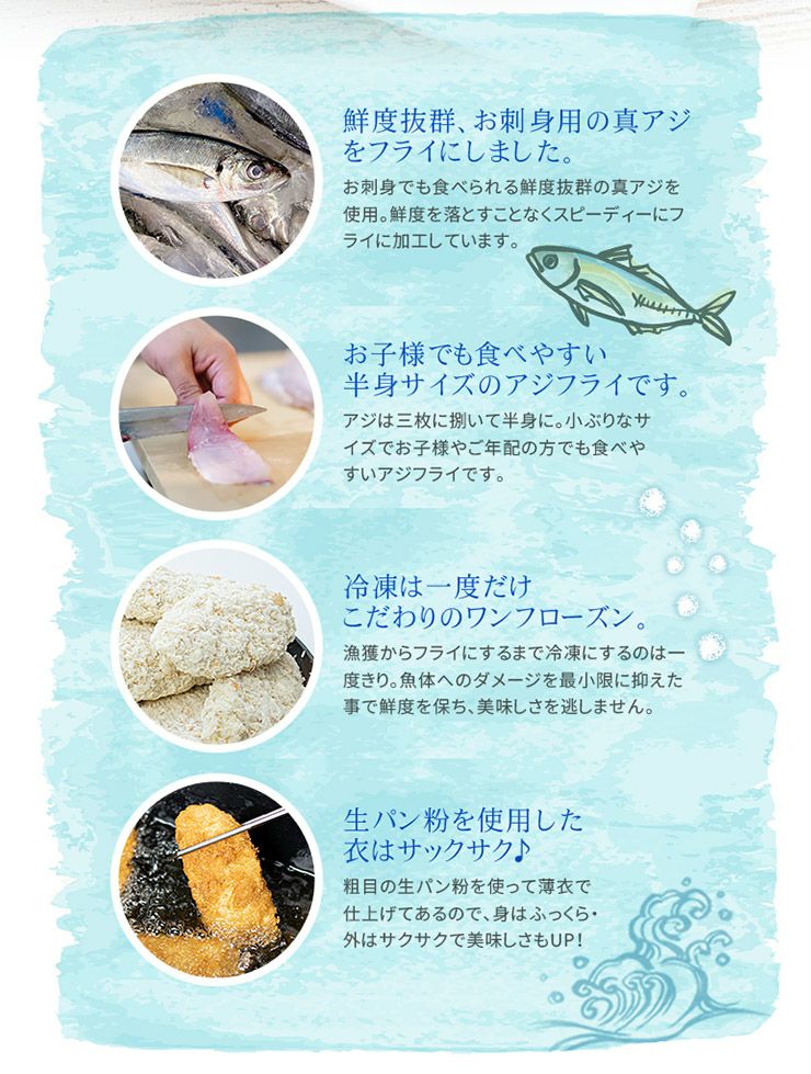 他の画像を見る 国産 アジフライ 210g(5~7枚入) お刺身用真アジを新鮮なままアジフライにしました 生パン粉を使用し外はサクサク中はふっくらジューシー 半身のアジ 油で揚げるだけ(お弁当 おつまみ おかず あじフライ) yd9 [[国産アジフライ210g] クール便でお届け 販売価格 ¥ 698 税込 在庫切れ 詳細を見る お気に入りに登録する