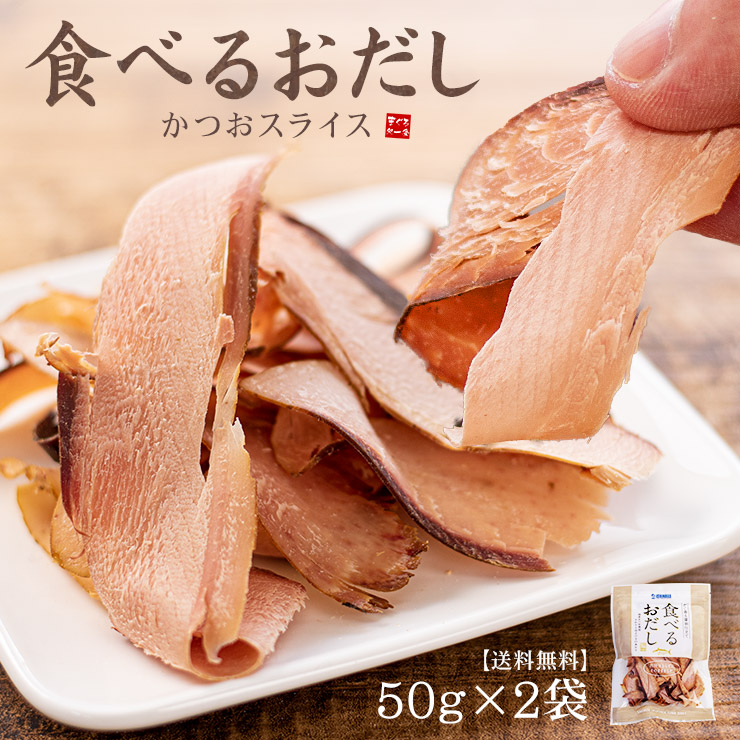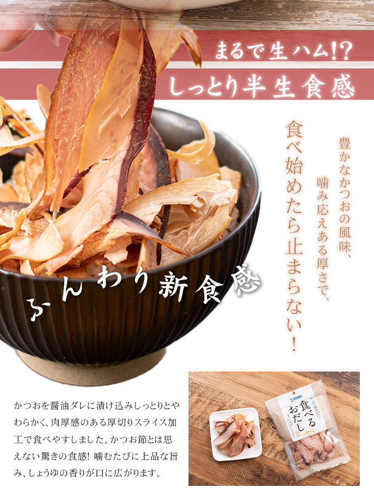 送料無料 食べるおだし 50g×2袋 厚切りなのにしっとり食感、醤油とかつおの風味がヤミツキに!おつまみ、おやつ、ご飯にかけたりサラダやパスタにも(そのまま食べる かつおスライス 鰹節)【ポスト投函便 常温 同梱不可】[[食べるおだし鰹-2p]