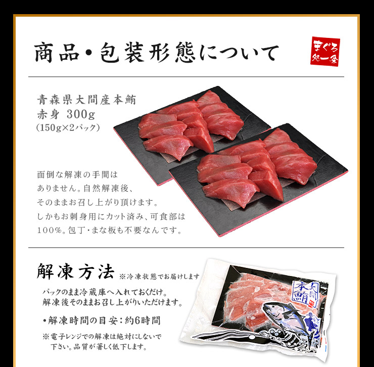 一度は食べたい青森大間産の本マグロ!赤身をたっぷり300gお届けします。しかもお刺身用にカット済みだから可食部100%、自然解凍でOK!