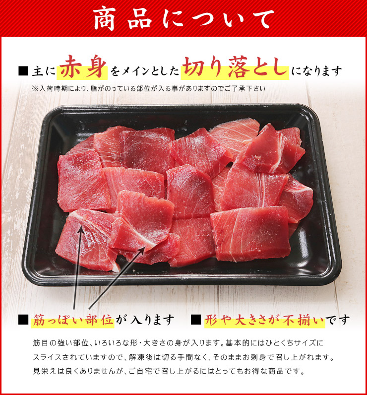 本マグロに次ぐ高級種「南マグロ」の切り落とし、たっぷり500g!形や大きさが不揃い、筋っぽい部位が入るお刺身パックですが、ご自宅用にお買い得な商品♪お刺身、鉄火丼、手巻寿司などでお楽しみ下さい。