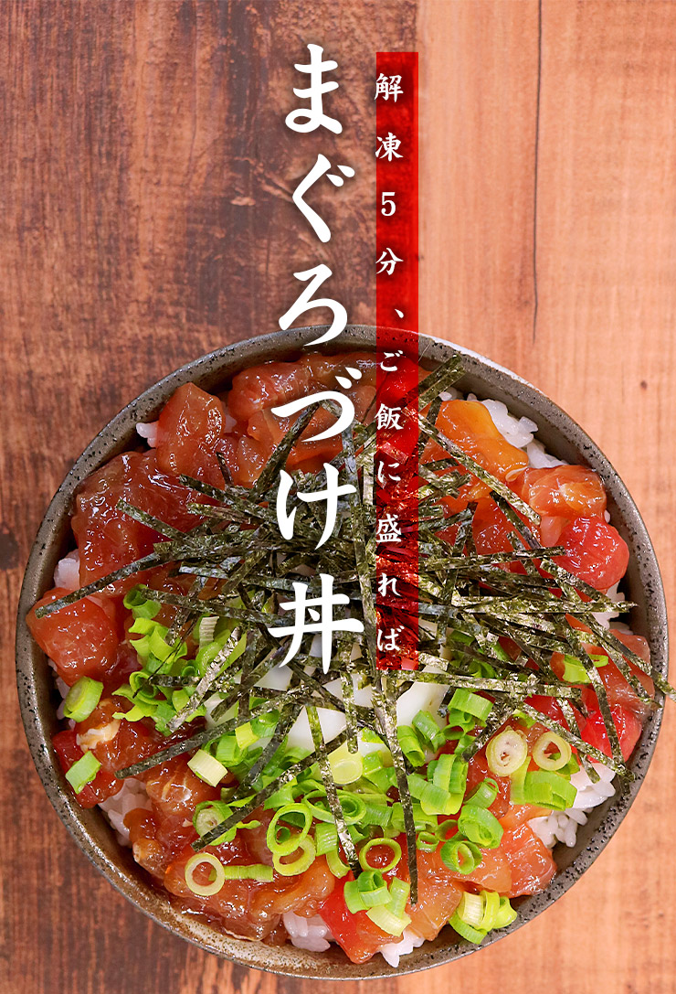 解凍してご飯に乗せるだけ、手軽に「まぐろ漬け丼」が楽しめます。