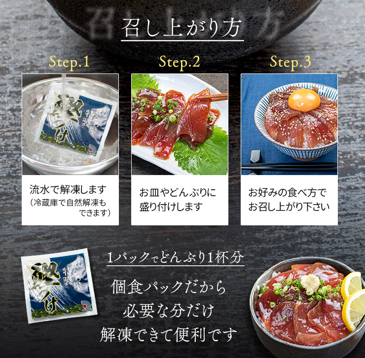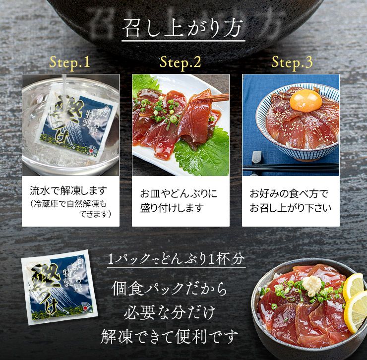 解凍してご飯に乗せるだけ、手軽に「カツオ漬け丼」が楽しめます。