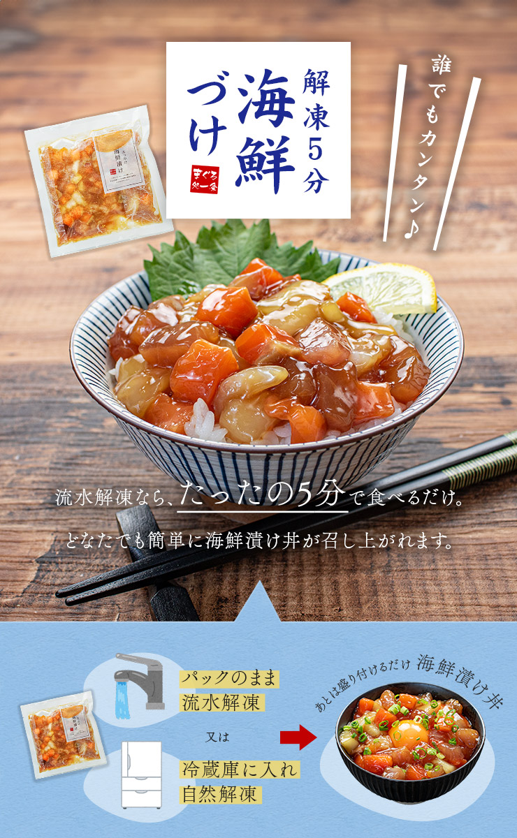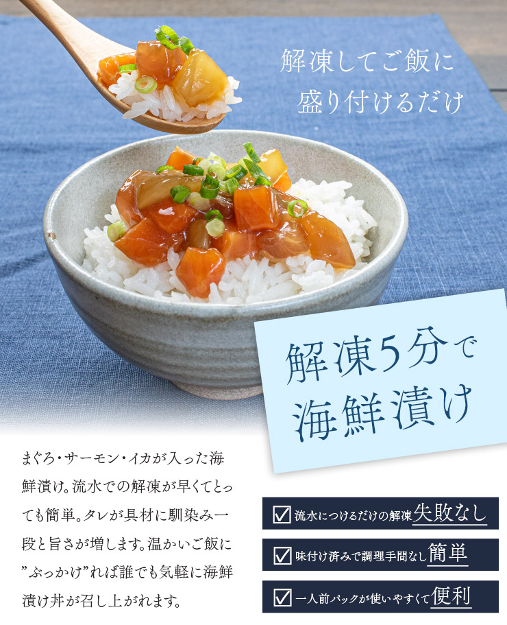 解凍してご飯に乗せるだけ、手軽に「海鮮漬け丼」が楽しめます。