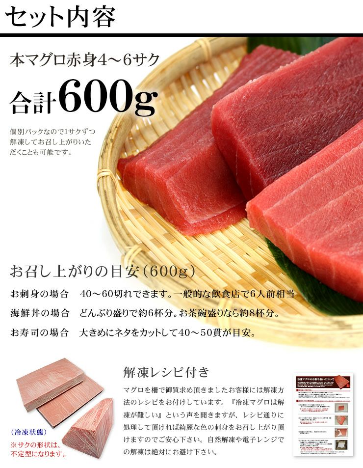 他の画像を見る 【送料無料】本マグロ赤身600g 解凍レシピ付 《pbt-bf3》〈bf1〉yd9[[赤身300g-2p] クール便でお届け 販売価格 ¥ 7,980 税込 可食部ほぼ100%!もっちり赤身をご堪能いただけます カートに入れる お気に入りに登録する