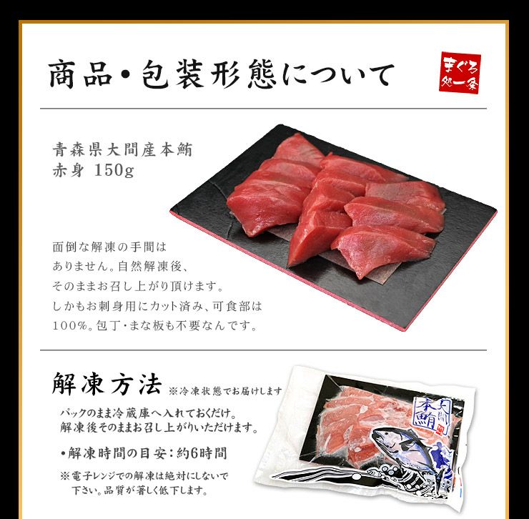 他の画像を見る 大間産本マグロ赤身150g カット済み 《dbf-om3》〈om1〉yd9[[大間産本鮪赤身] クール便でお届け 販売価格 ¥ 3,980 税込 自然解凍ですぐ食べられる!青森大間のプレミアム本マグロ カートに入れる お気に入りに登録する