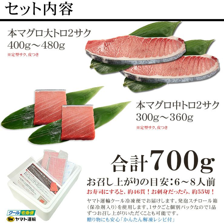 他の画像を見る 【送料無料】メガ盛り700g!極上本マグロ大トロ・中トロセット6~8人前 解凍レシピ付 《pbt-bf6》〈bf1〉yd9[[大中セット-2p] クール便でお届け 販売価格 ¥ 11,980 税込 鮪の王様「本マグロ」ギフトに人気の極上本鮪セット カートに入れる お気に入りに登録する