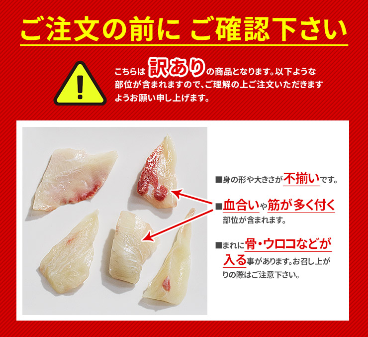 〇訳あり商品につき、小骨や薄皮がつく場合があります。また身の大きさは不揃いです。