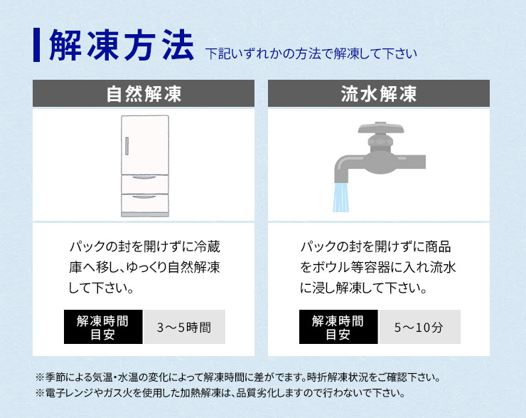 冷蔵庫内で自然解凍、またはパックのまま流水解凍