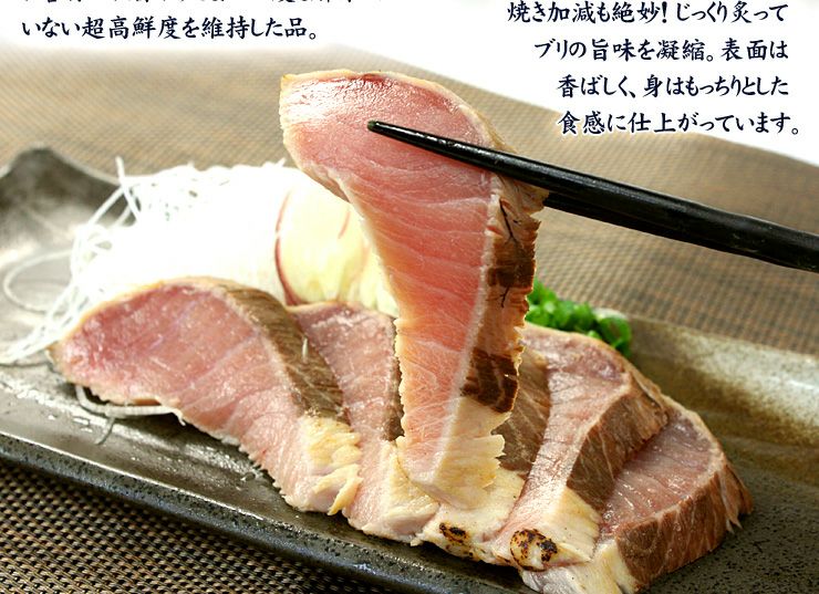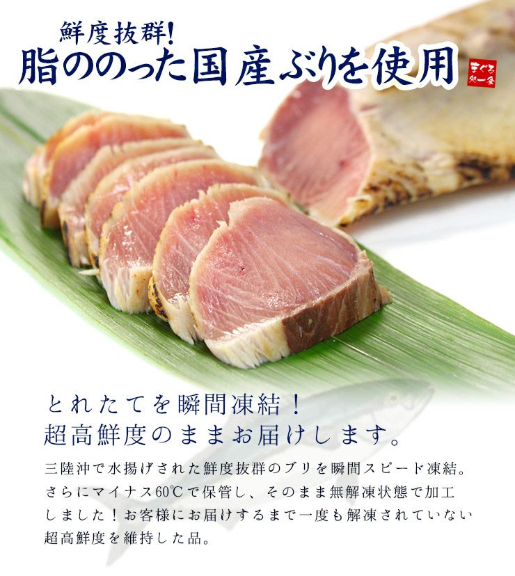 他の画像を見る 国産天然ぶりタタキたっぷり500g!脂ののった鮮度抜群のブリを焼き上げ旨味をギュッと閉じ込めました 背または腹、2~4片入り《ref-br1》〈br1〉yd5[[ぶりタタキ500gセット] クール便でお届け 販売価格 ¥ 2,480 税込 在庫切れ 詳細を見る お気に入りに登録する