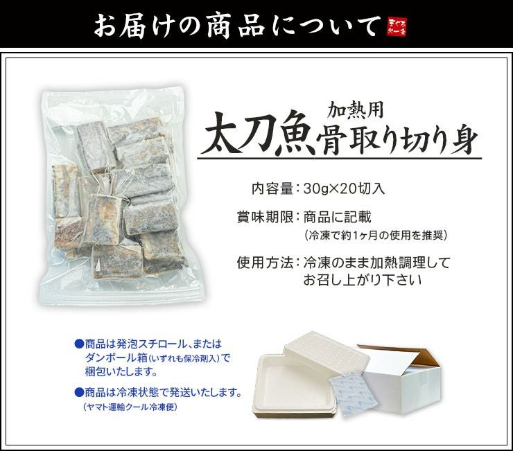 他の画像を見る 【すぐに使えるバラ冷凍】チャック袋入り 骨取り 無添加 無塩 太刀魚 骨取り切り身 30g×20切れ 加熱用 無塩 バラ凍結 チャック袋入 (たちうお 弁当 朝食) [[タチウオ骨取り切り身] クール便でお届け 販売価格 ¥ 1,980 税込 カートに入れる お気に入りに登録する