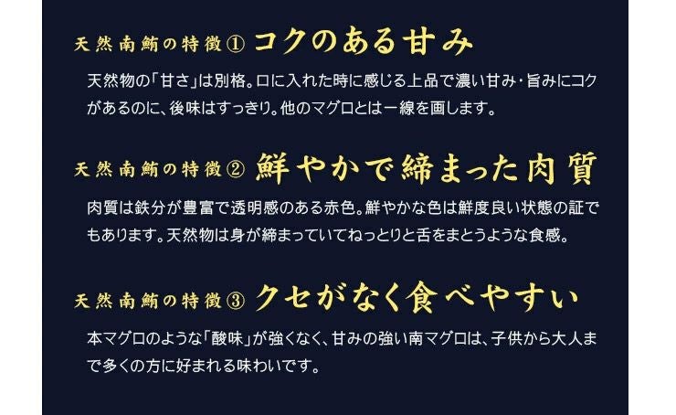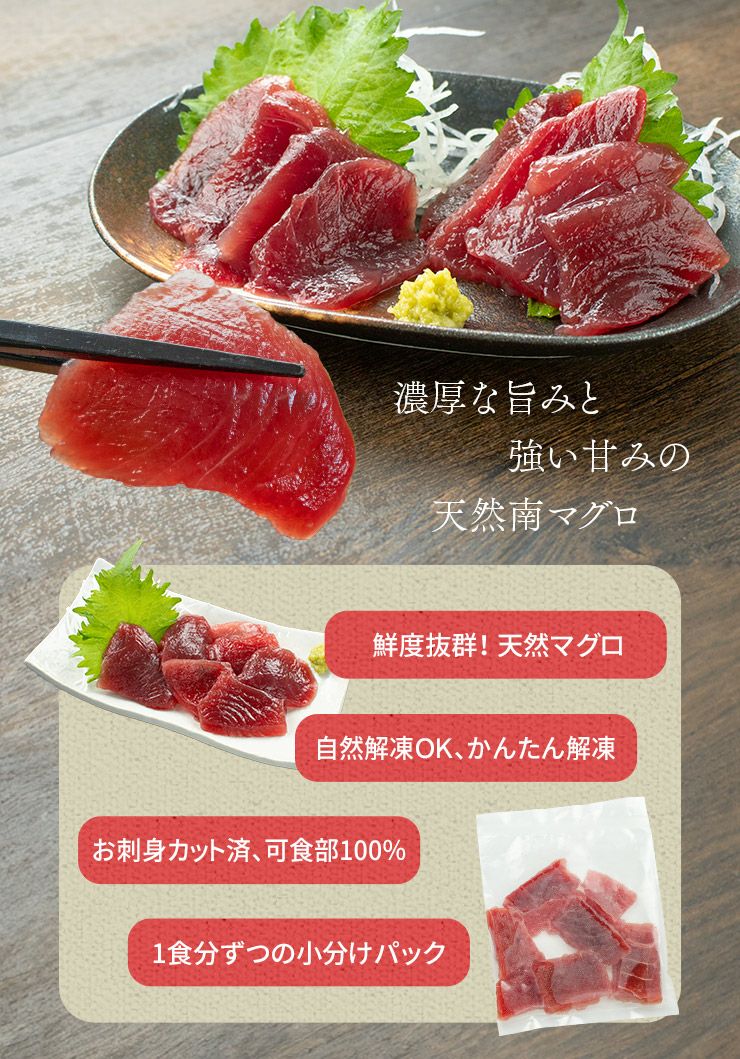 他の画像を見る 今や貴重な「天然南マグロ」食べ放題! 天然南マグロ 訳あり赤身1kg ※骨付き・形不揃い 魚体の中心に近い赤身はなめらかな食感と濃厚な旨みが特徴 送料無料 解凍レシピ付(ミナミ鮪 寿司 手巻き寿し おつまみ 刺身 肴 まぐろ インド鮪 敬老の日)《pbt-sb4》〈sb1〉[[天然ミナミ鮪訳あり赤身1kg] クール便でお届け 販売価格 ¥ 6,980 税込 在庫切れ 詳細を見る お気に入りに登録する