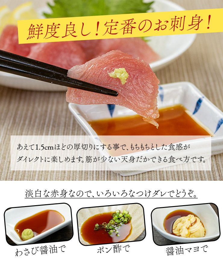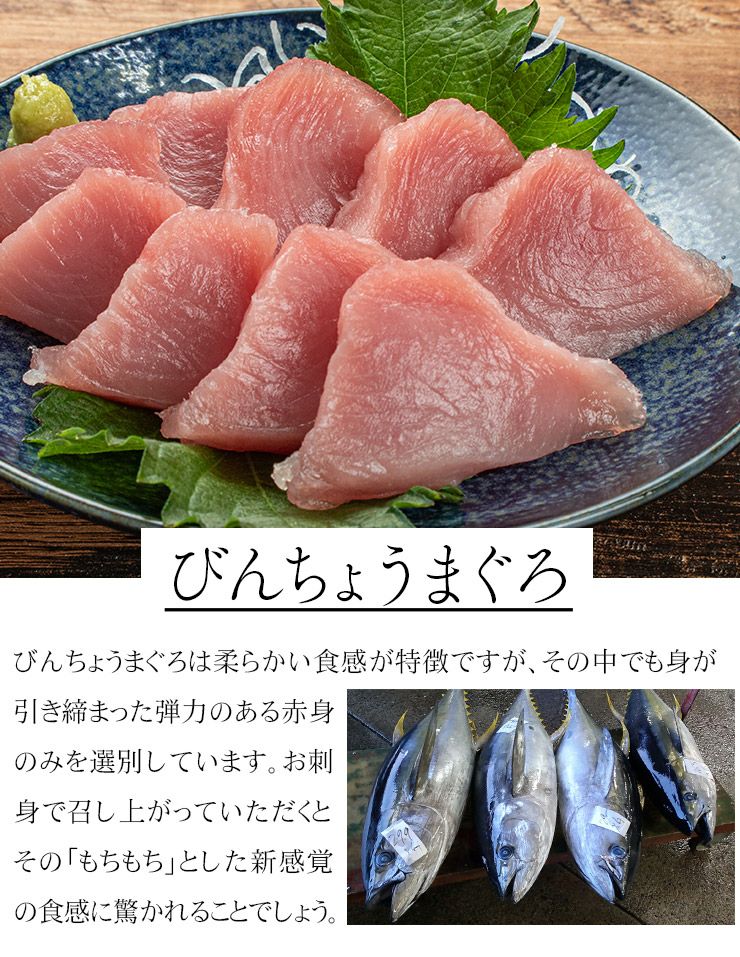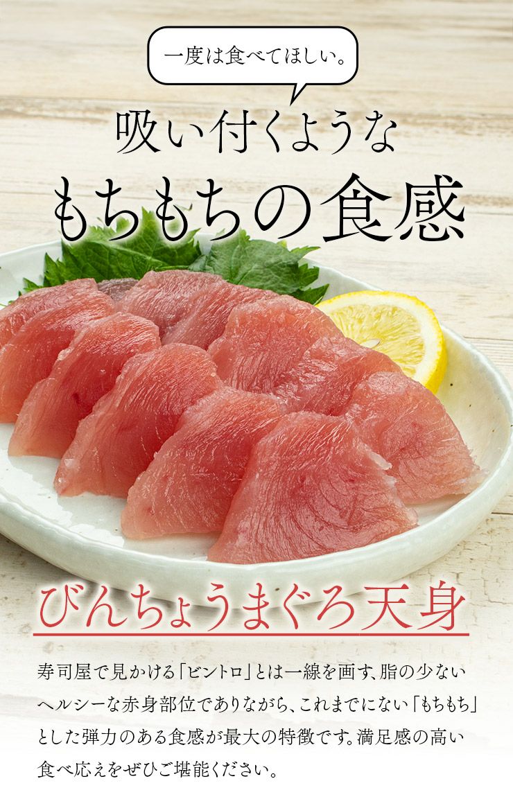 他の画像を見る スーパーにはない高品質、ねっとりとした食感のびんちょう(マグロ 鮪) スーパーにはない高品質、ねっとりとした食感のびんちょう(マグロ 鮪) びんちょうマグロ 天身(赤身)500g 3~7ブロック入り 筋が少なく柔らかい身、もちもちで弾力のある食感 解凍レシピ付(鮪 刺身 海鮮丼 手巻き寿司 おつまみ プレゼント ギフト)〈bn1〉《pbt-al1》[[びんちょうマグロ天身500g] クール便でお届け 販売価格 ¥ 2,998 税込 在庫切れ 詳細を見る お気に入りに登録する
